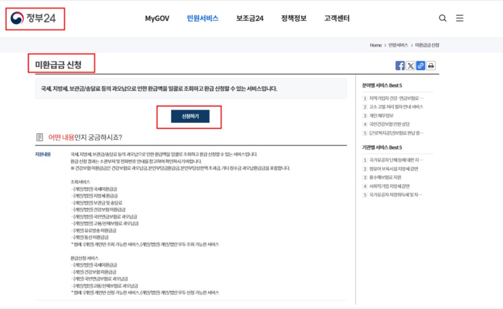 민원서비스 미환급금 화면에서 바로 조회와 신청이 가능합니다.