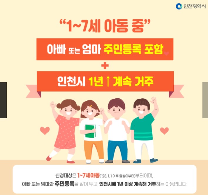 ※ 이번 2024년도 신청 및 지급 대상자는 2023년 1월 1일 부터 6월 9일까지 인천광역시에서 출생한 아동입니다.