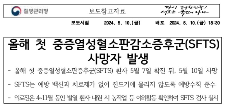 질병관리청은 보도자료를 통해 올해 첫 중증열성혈소판감소증후군(SFTS) 환자가 5월 7일 확진 뒤, 5월 10일 사망했다고 발표했습니다. (2024.1.1~5.10 사이에 4명 발생(3명 치료 완료, 1명 사망)