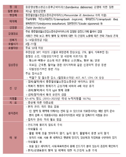 주로 야외활동이나 농작물 작업 시 바이러스 보유 진드기에 물린 경우 감염됩니다.