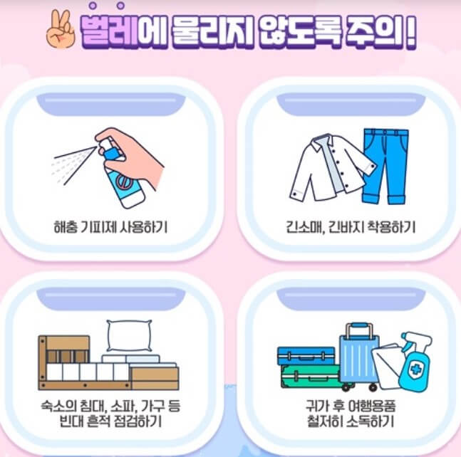 특히 말라리아, 뎅기열, 지카 전염과 유사한 모기 매개 질병이 있는 지역에서는 벌레 물림을 예방하기 위한 조치를 취하십시오.