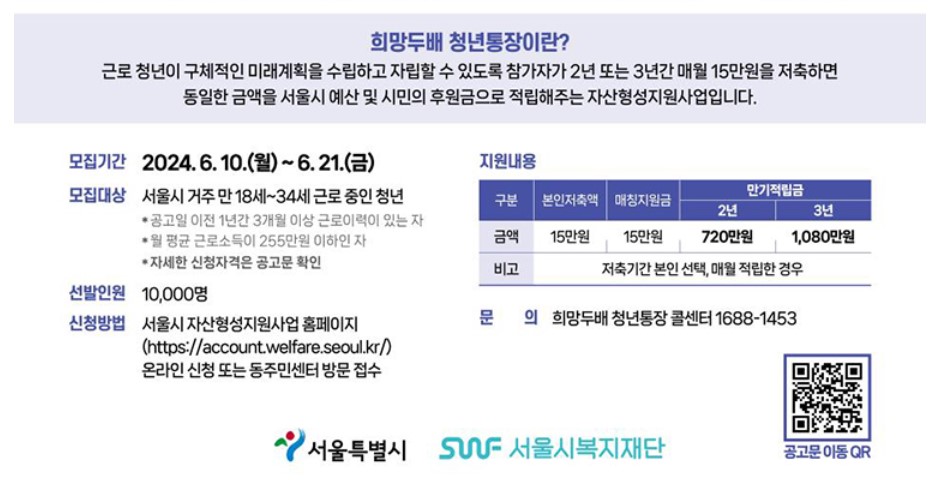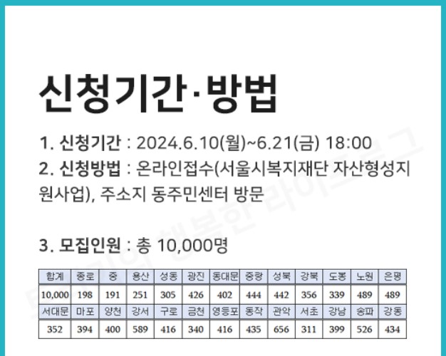 더 자세한 내용은 서울시 자산형성지원사업 홈페이지에서 확인 가능 합니다.