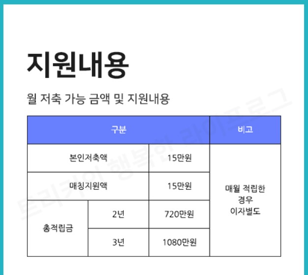 매월 15만원씩 3년 저축하면 합계 540만원 + 2배 지원 = 총액 1080만원 만기적립금