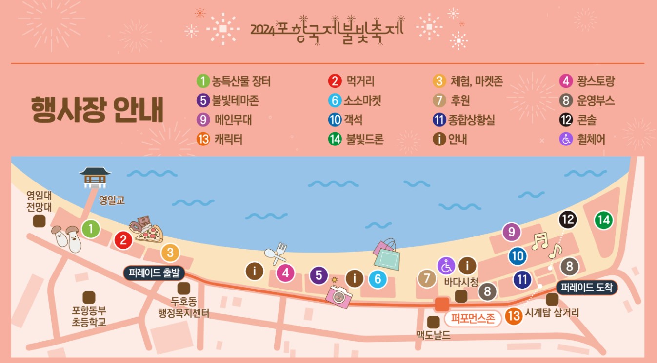 | 목 차 ㅇ 2024 포항국제불빛축제 일정 - 타임 테이블 ㅇ 2024 포항국제불빛축제 프로그램 - 국제불꽃경연대회 & 그랜드피날레 - 영일대 해수욕장 메인무대 프로그램 - 공연 프로그램 - 부대행사 - 프로그램 상세설명 & 상설행사 ㅇ 2024 포항국제불빛축제 주차정보 - 주차정보 ㅇ 2024 포항국제불빛축제 명당자리 - 환호공원 - 포항방파제 ㅇ 2024 포항국제불빛축제 주변 맛집 - 새포항물회집 - 환호횟집 - 헤이안 ㅇ 2024 포항국제불빛축제 유튜브 채널 |